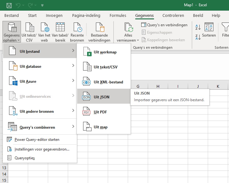 Het uploadveld accepteert geen JSON bestanden. Wel is het mogelijk om een JSON bestand in Excel te openen en als Excelbestand (.xls of .xlsx) op te slaan. Je kunt de JSON data op deze manier in Excel openen: