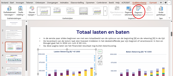 De achterliggende cijfers zijn beschikbaar in de PowerPoint-factsheet. Als je dubbelklikt op een grafiek, opent de menubalk Grafiekontwerp, met daarop de knop Gegevens bewerken. Die functie biedt de keuze uit ‘Gegevens bewerken’ (in PowerPoint) en ‘Gegevens bewerken in Excel’; beide opties geven een tabel met de onderliggende data die bewerkt kan worden.